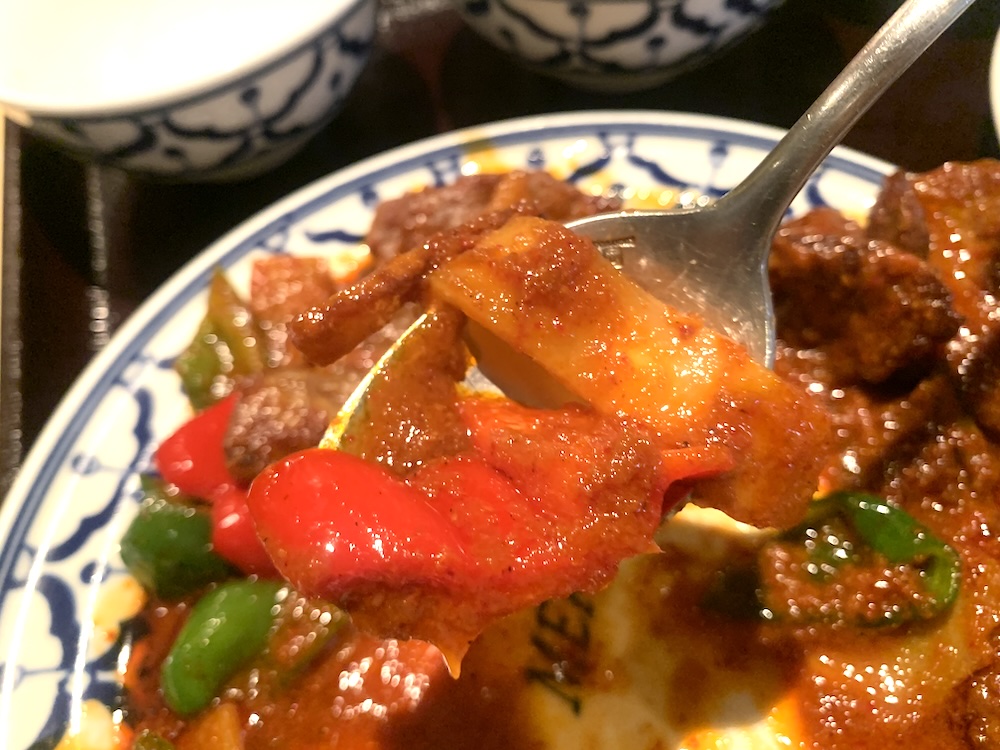 見た目ほど辛くなくて、コクのあるペーストにお肉や野菜が絡んでクセになる味。